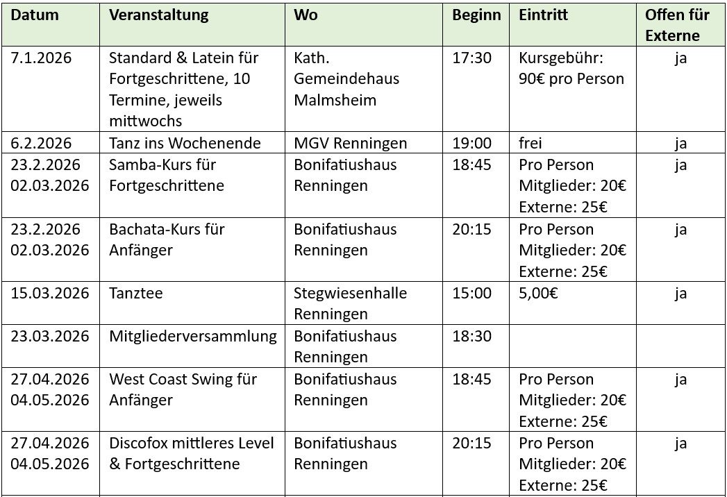 Die Anmeldung erfolgt durch die Überweisung der Kursgebühr auf unser Vereinskonto: Tanzsportclub Renningen Malmsheim e.V., IBAN: DE17 6039 0300 0250 6070 00, Volksbank Leonberg-Strohgäu eG. Bitte als Verwendungszweck „West Coast Swing“ angeben. Anmeldeschluss ist der 22.4.2026.
